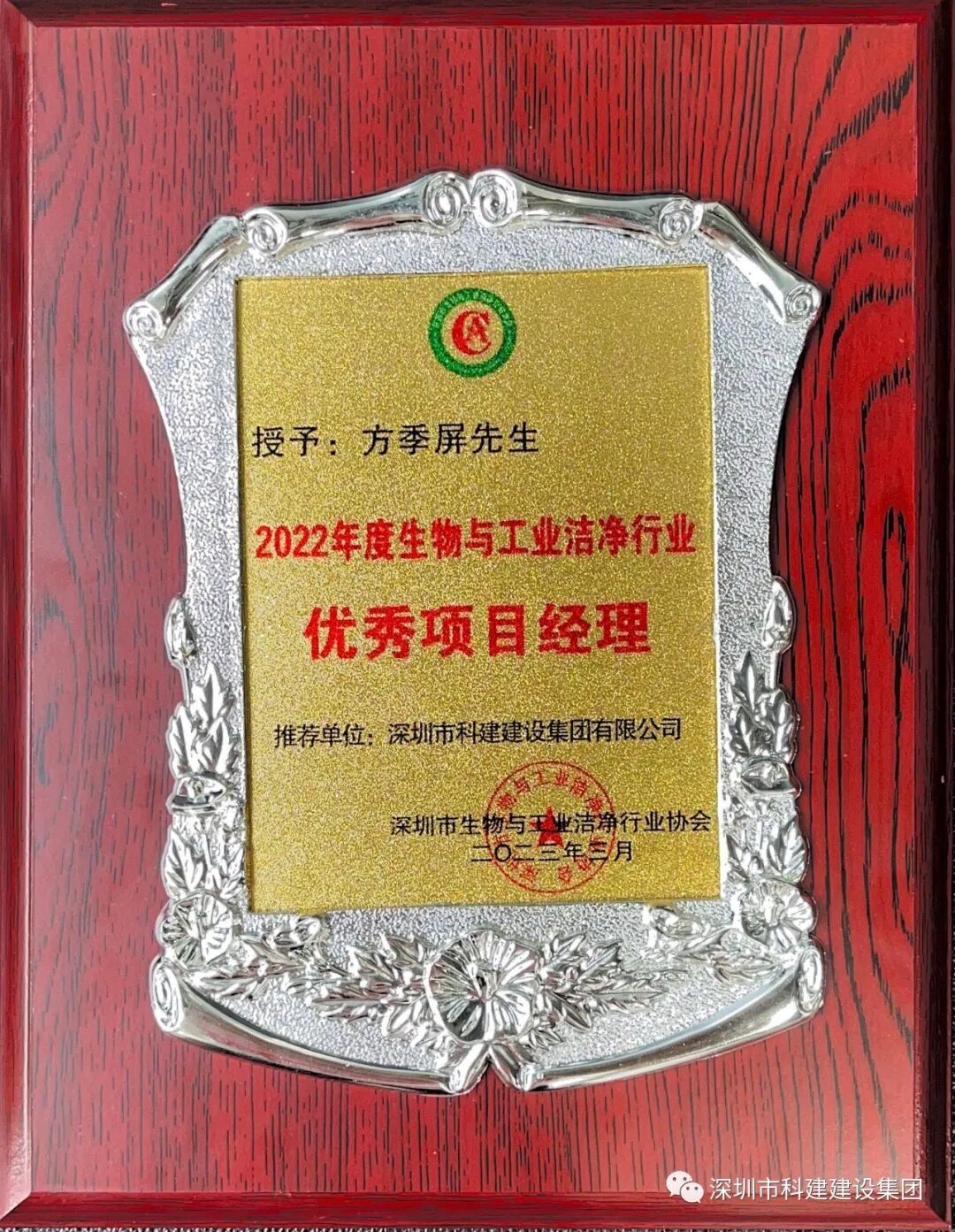 深圳市科建建设集团总工办技术总监方季屏被评为2022年度洁净行业优秀项目经理。